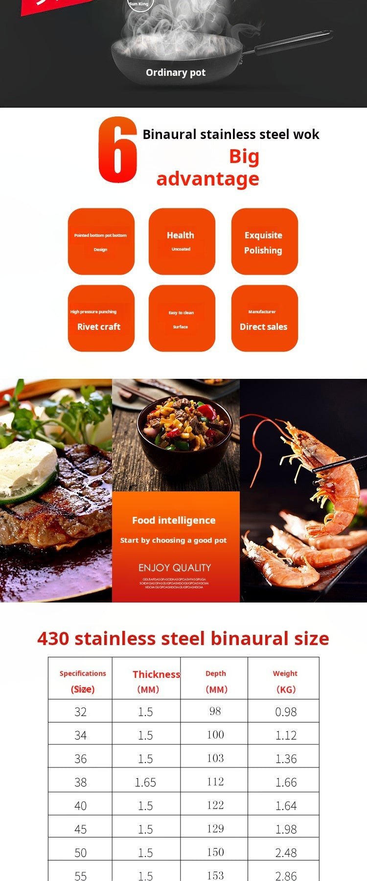 Factory direct 430 stainless steel wok, thickened single bottom, round bottom, wear-resistant, uncoated household commercial pan
